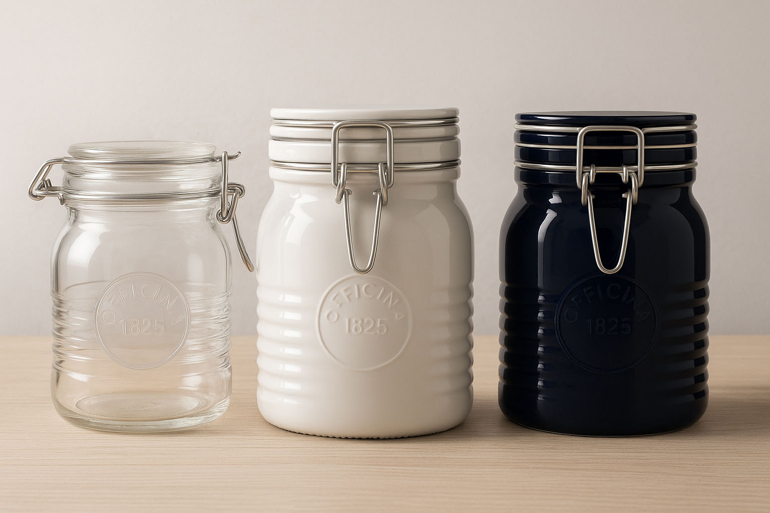 Serija „Officina 1825“ talijanskog proizvođača Bormioli Rocco spaja vrhunsku izradu s nostalgičnim šarmom. Prepoznatljiv dizajn s rebrima na staklenom tijelu i utisnutim logom „1825“ čini svaki čašu pravim ukrasom. Ove elegantne staklenke sa žičanim zatvaračem posebno su razvijene za proizvođače delikatesa, hotele i zahtjevne privatne punioce koji cijene estetiku i kvalitetu. Dostupne u bojama plava, crvena i bijela kao dio posebne serije Color, „Officina 1825“ nudi ekskluzivnu mogućnost da se fine specijalitete ukusno i sigurno čuvaju.